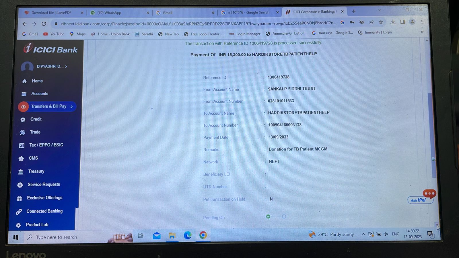 केंद्रीय क्षयरोग विभागाच्या विनंतीनुसार; संकल्पसिद्धी ट्रस्ट क्षयरुग्णांना मदतीचा हात देत आहे. संपल्प सिध्दी ट्रस्ट मुंबई यांच्या वतीने दि. ९ नोव्हेंबर २०२३ रोजी दादर, माहीम आणि धारावी क्षयरोग रुग्णांसाठी (निक्षय मित्र या संकल्पने अंतर्गत मदत) योग्य पोषक आहार (ड्राय रेशन) वाटप करण्यात आले आहे.