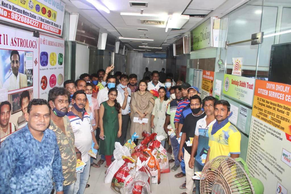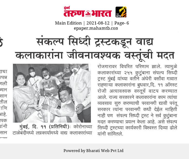 कोरोनाच्या टाळेबंदीमध्ये लग्नकार्यामध्ये वाद्य कलाकारांच्या रोजगारावर विपरित परिणाम झाले. त्यामुळे कलाकारांच्या २५५ कुटुंबाना संपल्प सिध्दी ट्रस्ट मुंबई यांच्या वतीने अंधेरी वर्सेवा गावात राहणाऱ्या कलाकारांना बुधवार,दि. ११ ऑगस्ट रोजी अत्यावश्यक वस्तूचे वाटप करण्यात आले. राज्य सरकारने कलाकारांना काम त्यांचा व्यवसाय सुरु करण्याची परवानगी द्यावी परंतू सरकार त्यांना परवानगी कधी देईल माहिती नाही पण संपल्प सिध्दी ट्रस्ट ने सर्व कुटुंबाना मदत करण्याचा प्रयत्न केला आहे. असे संकल्प सिध्दी ट्रस्टच्या कार्यकारी विश्वस्त दिव्या ढोले यांनी सांगितले.