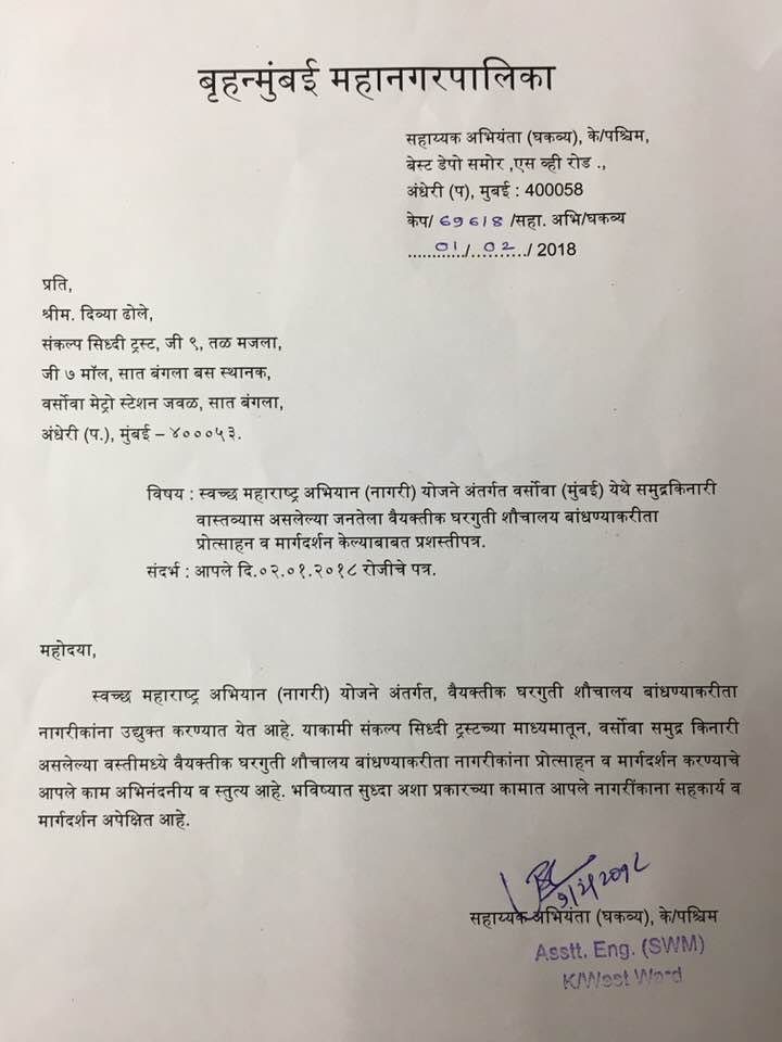 Efforts pay for Sankalp Siddhi Trust as MCGM recognises the work done by us for “Devachi wadi , Versova, Andheri west “, residents to get MCGM permission & Rs 5000/- each construction cost to “60 households” for building in-house toilets under Swach Maharashtra Scheme (Urban). This helps to reduce open defecation on versova beach seaside in big way.