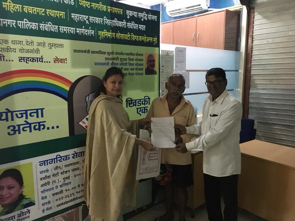 संकल्प सिद्धी ट्रस्ट - नागरिकांच्या सेवे साठी नेहेमीच तत्पर असते. देवाची वाडी येथील १०५ रहिवास्यांची यादी निवेदन पत्रा सहित मला देण्यात आली. प्रत्येक फॉर्म स्वच्छ भारत अभियान पोर्टल वर अर्जदाराच्या माहिती सहित भरला गेला आणि मग मुंबई महानगर पालिके सोबत संपर्क साधून SWM व Maintenance dept ला बोलावून देवाची वाडीतील १०५ घरांचं सर्वेक्षण ऑगस्ट २०१७ मध्ये करून घेतल गेला . सर्वेक्षण झाल्यावर ६० अर्जदारांना मुंबई महानगर पालिके (के पश्चिम वॉर्ड) कडून घरात सौचालाय बांधण्याची परवानगी प्राप्त झाली.